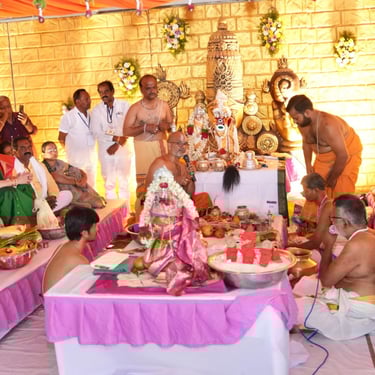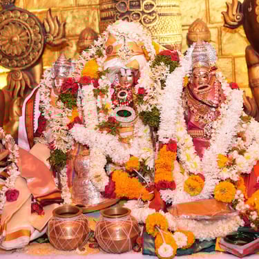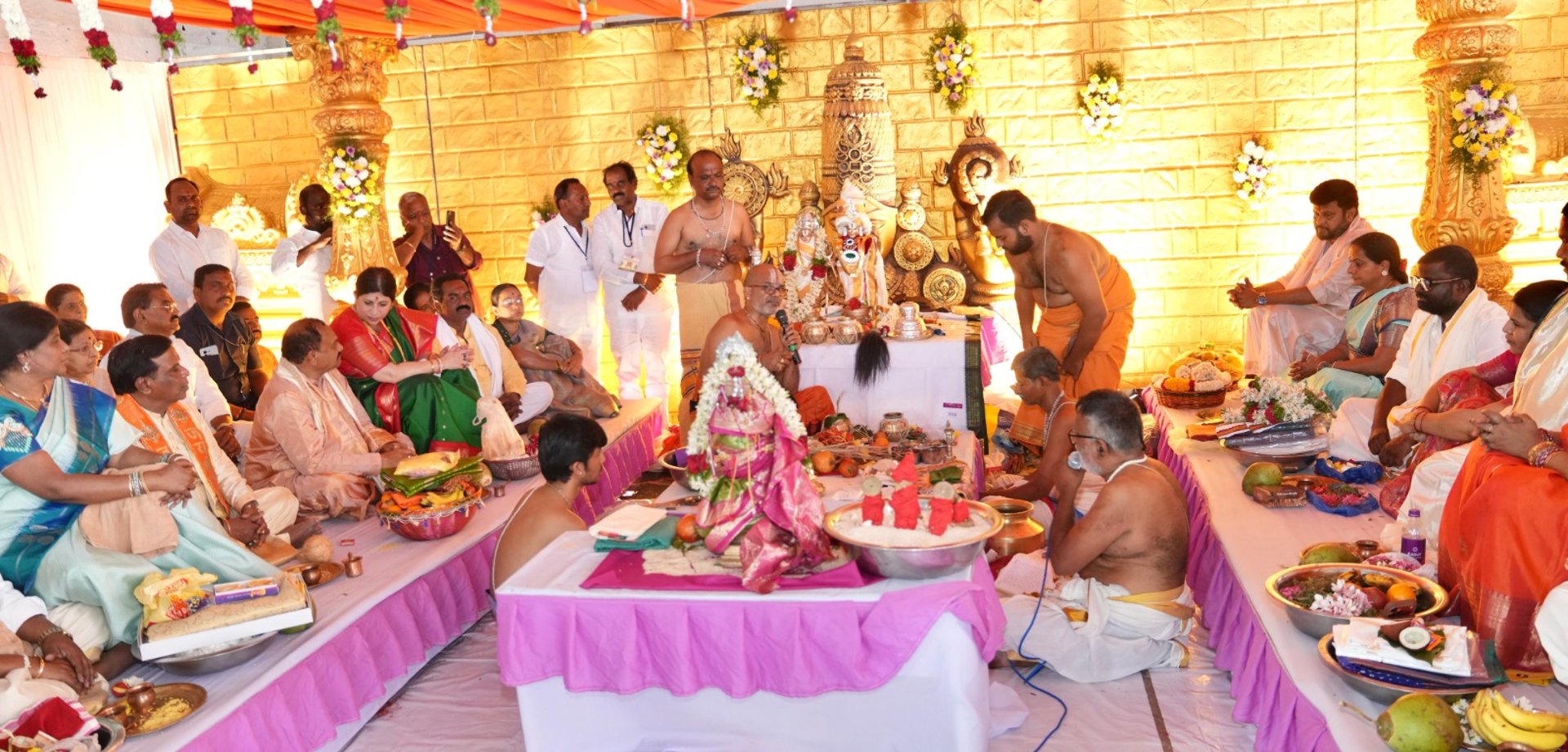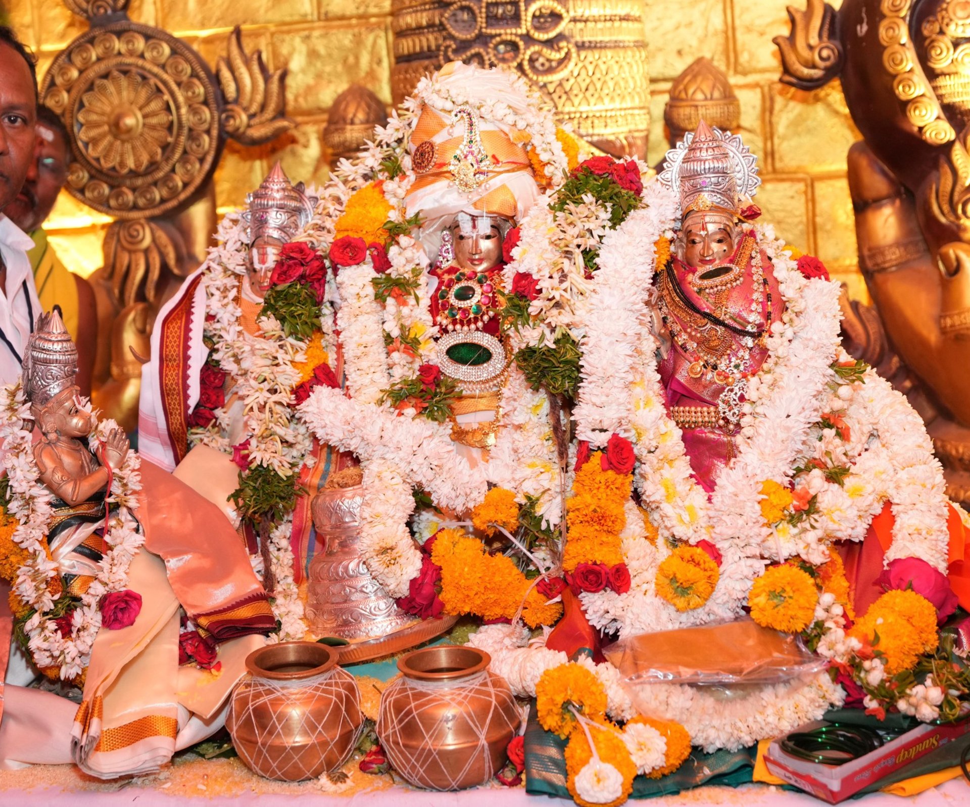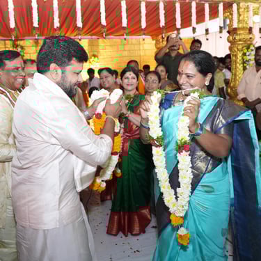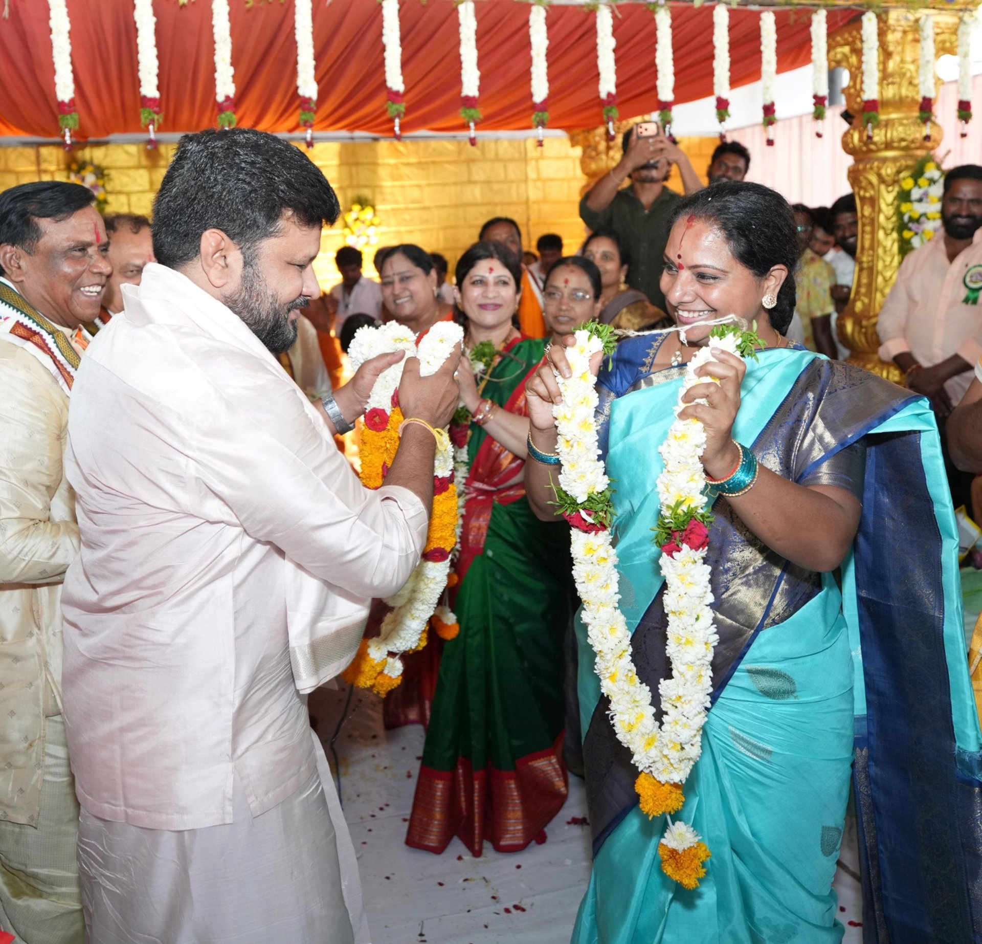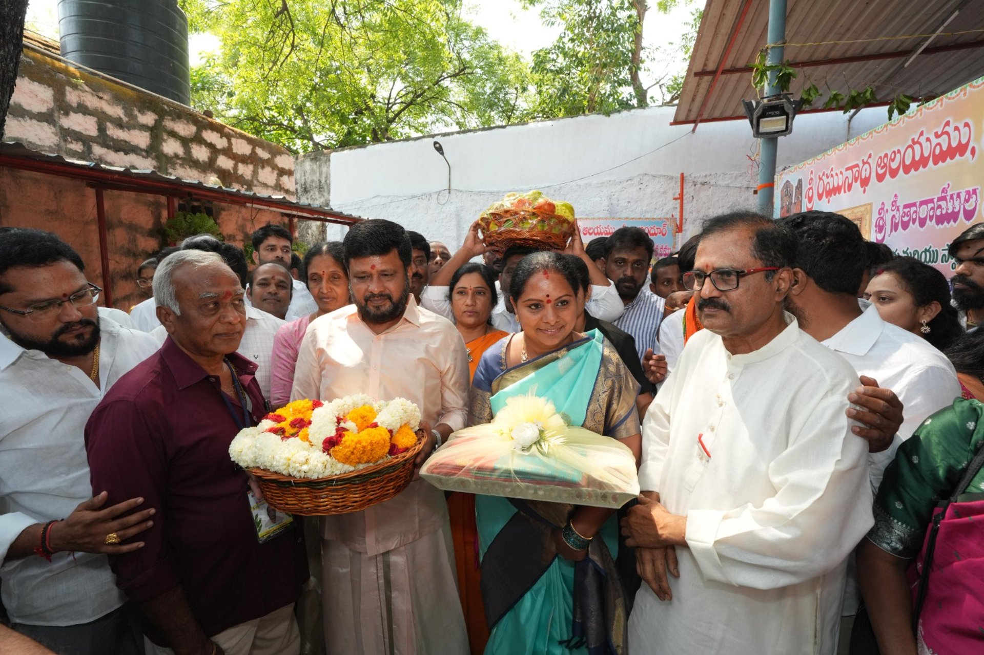 నిజామాబాద్, మార్చ్ 27 - నిజామాబాద్ శ్రీ రఘునాథ ఆలయం (ఖిల్లా రాంమందిర్) లో శ్రీ సీతారాముల కళ్యాణోత్సవంలో పాల్గొన్న కల్వకుంట్ల కవిత - దేవనపల్లి అనిల్ దంపతులు.ఈ సందర్భంగా శ్రీ సీతారాముల కళ్యాణానికి పట్టువస్త్రాలు,ముత్యాల తలంబ్రాలు అందజేసారు.దంపతులకు సంప్రదాయబద్ధంగా స్వాగతం పలికి ప్రత్యేక పూజలు చేయించిన అర్చకులు.